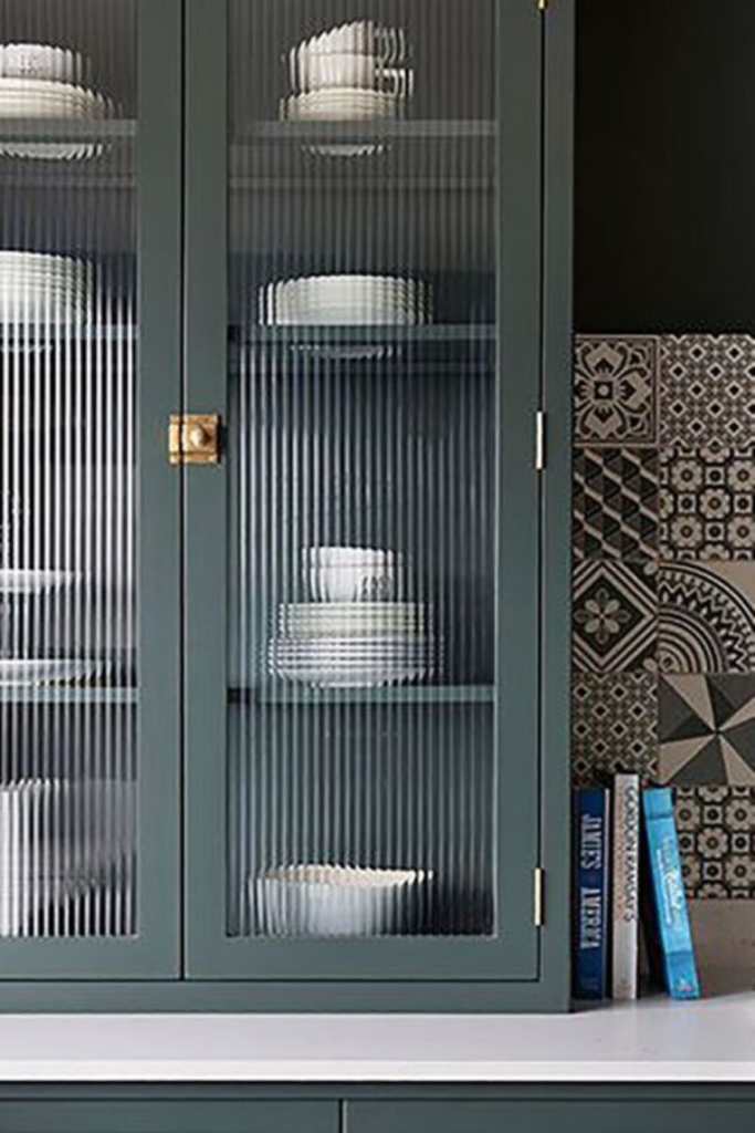 Glass Shutter: A clear or frosted glass panel, framed or unframed, that brings a light and airy feel to kitchen cabinets.