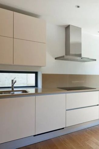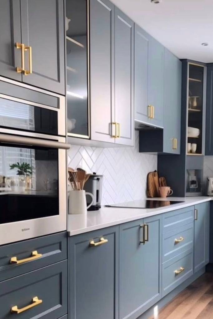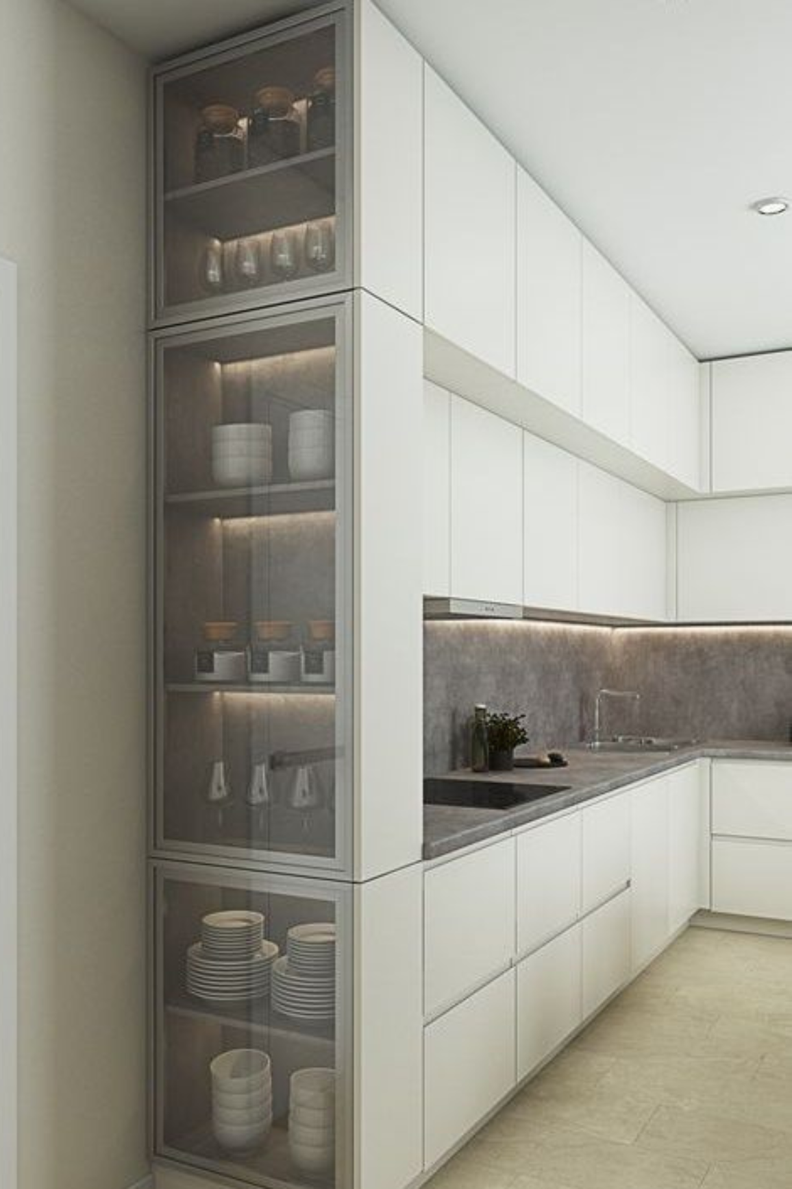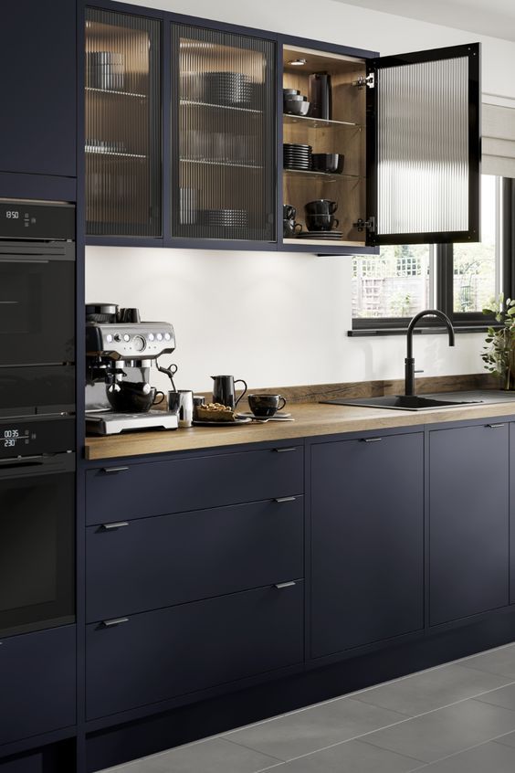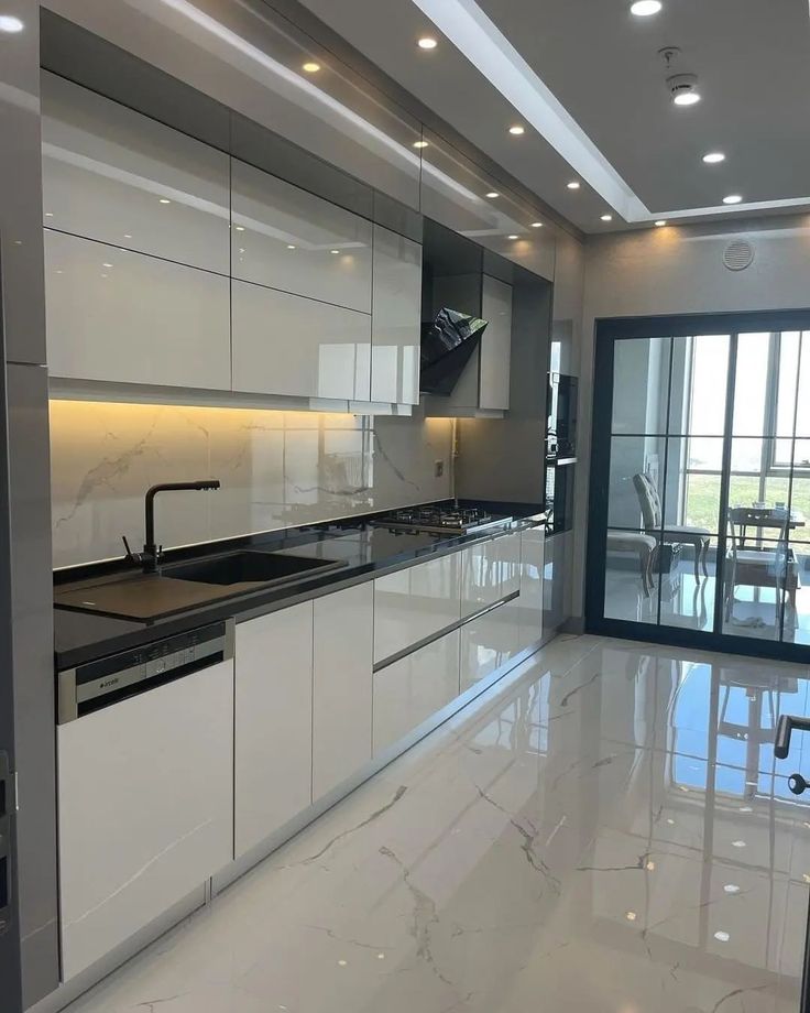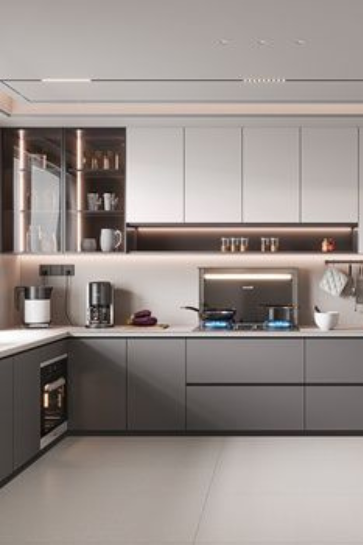 Glass finishes give kitchens a sleek, modern, and reflective surface, adding light and elegance.
