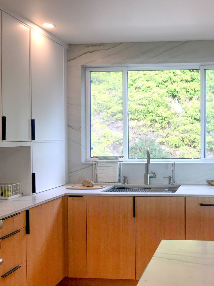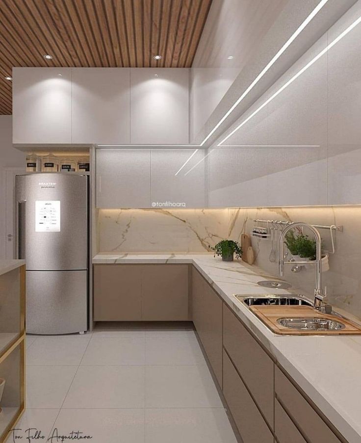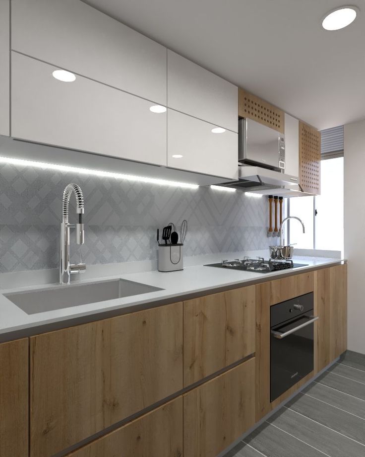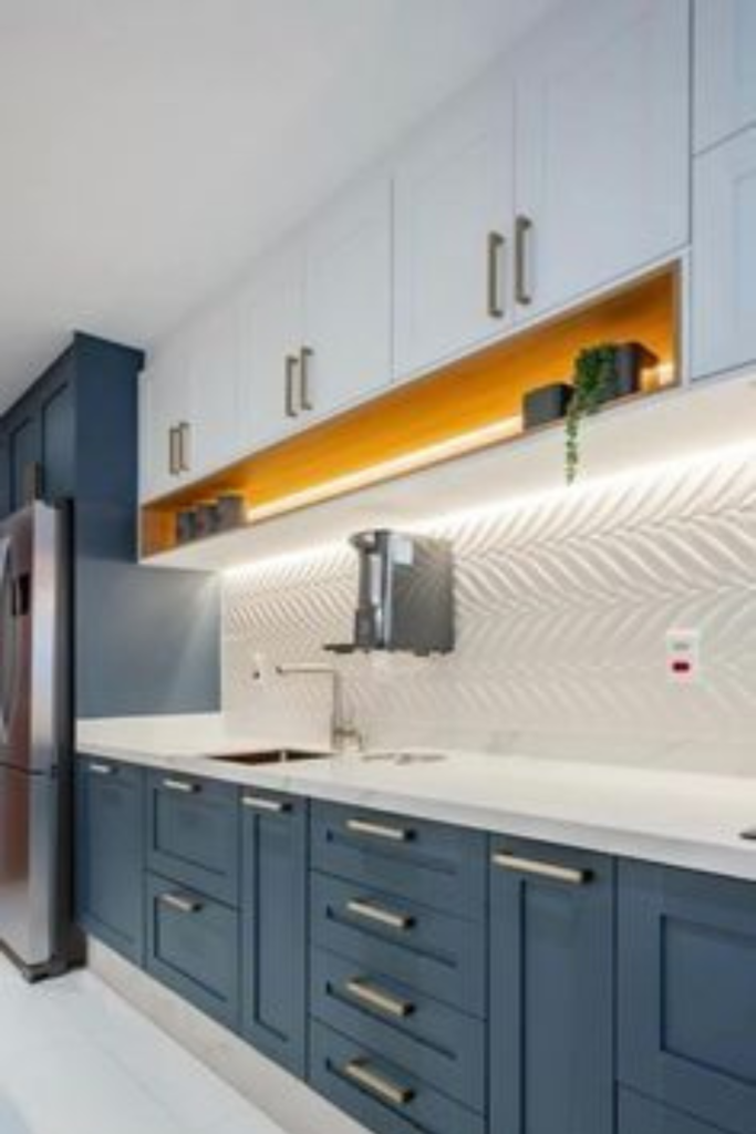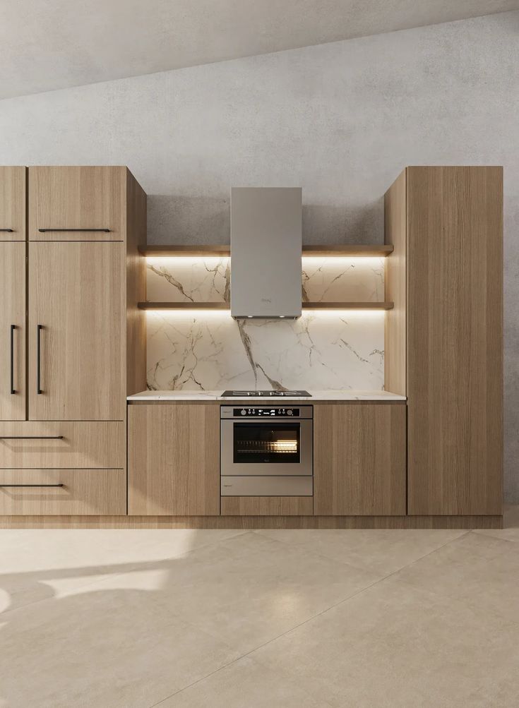 A blend of modern finishes that combine minimalism, clean lines, and subtle textures to create a sophisticated and functional kitchen space.